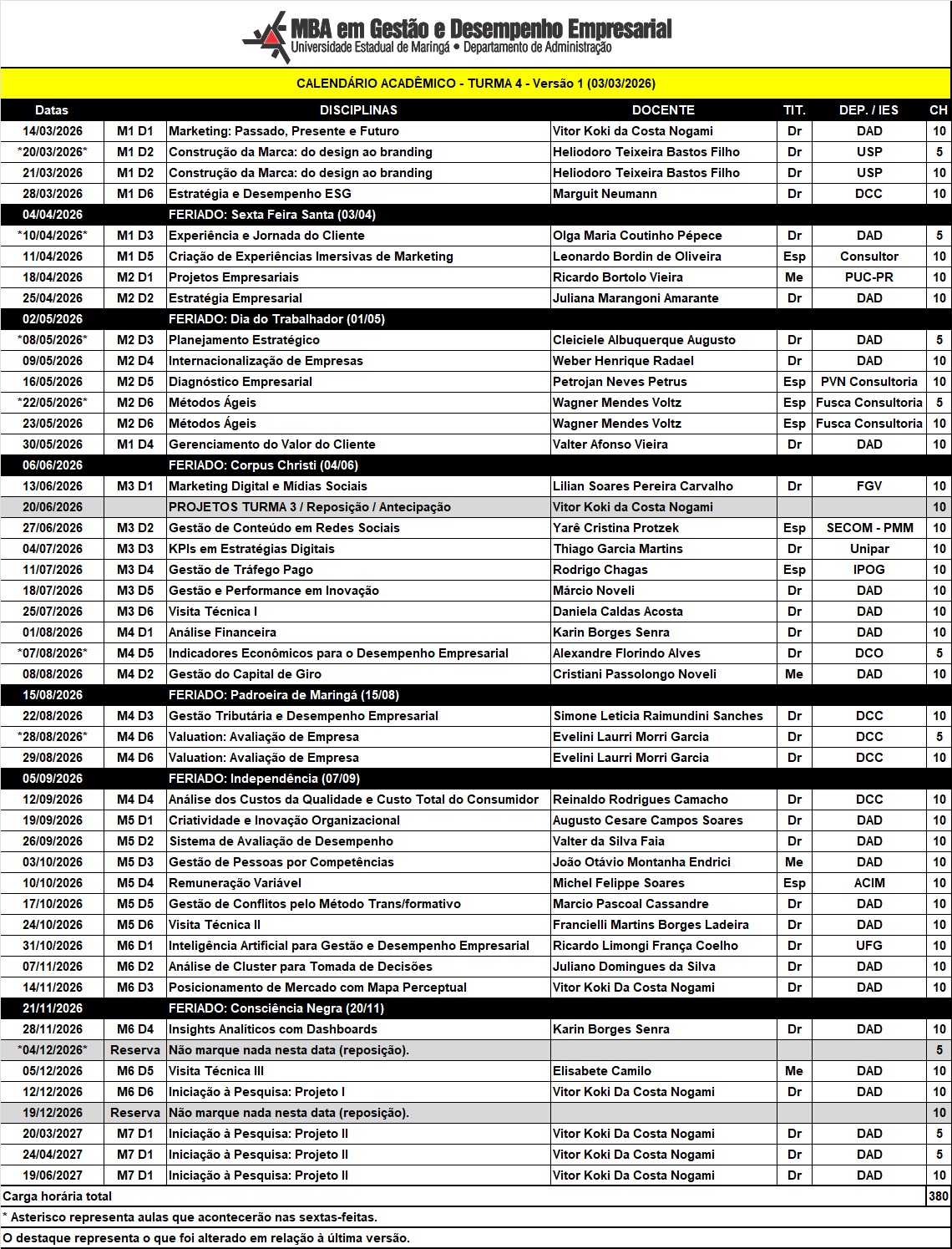 CALENDÁRIO MBA - TURMA 4 - Atualizado em 26/02/2026.