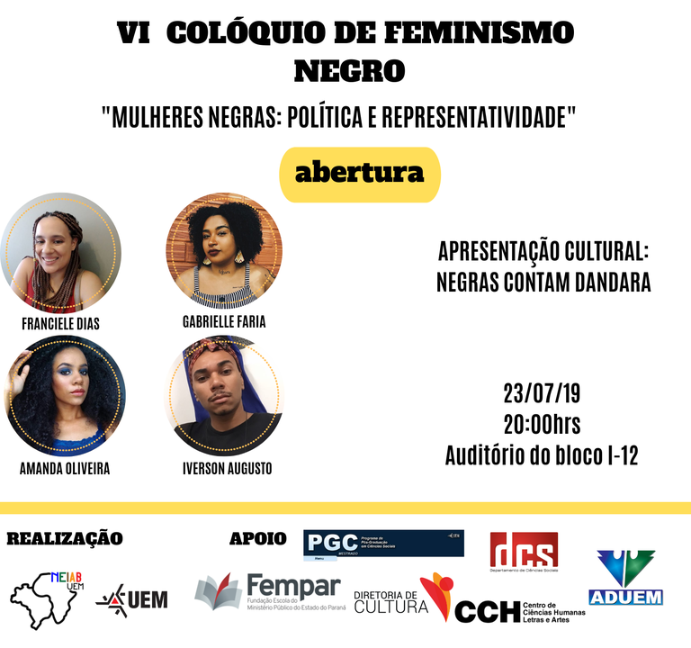 Como parte da programação do VI Colóquio de Feminismo Negro, seremos contemplados com a apresentação cultural: "Negras Contam Dandara". Grupo de Teatro Negro Político organizado por: Franciele Dias (Artes Cênicas); Amanda Reis (Artes Cênicas) ; Gabrielle Faria (Artes Cênicas); Iverson Augusto (Artes Cênicas).