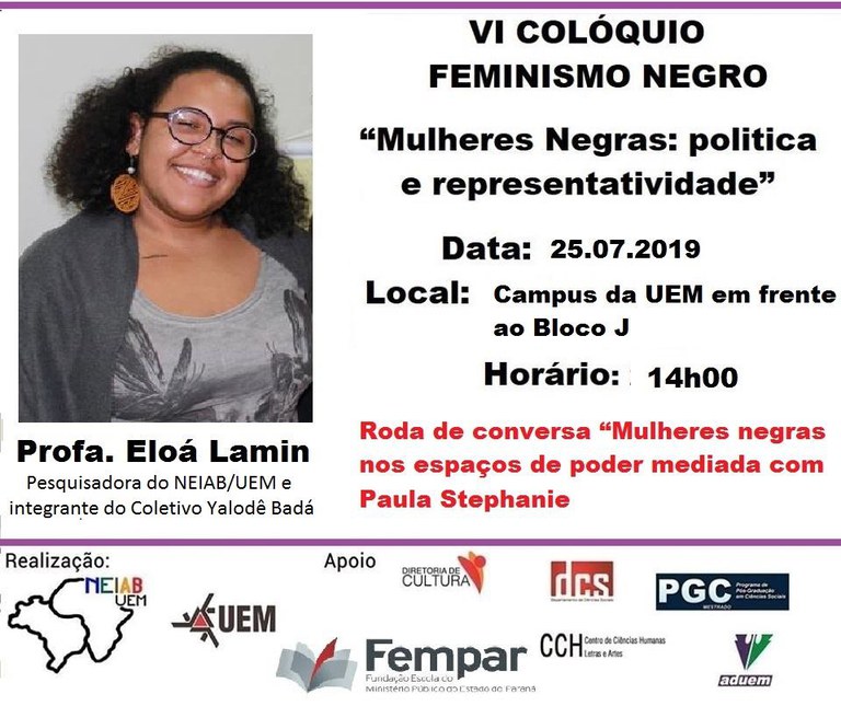 Está confirmada a participação da Profa. Eloá Lamin –pesquisadora do NEIAB/UEM e integrante do Coletivo Yalodé-Badá na Roda de Conversa "Mulheres negras nos espaços de poder” mediada com Paula Stephanie