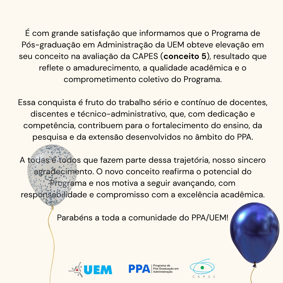 O Programa de Pós-Graduação em Administração da UEM oferece política de ações afirmativas (cotas) para pessoas negras e indígenas, desde o processo seletivo para as turmas 2021. O número de vagas oferecidas em cada processo seletivo é fixado em edital de inscrições, observando-se o percentual de 20% (vinte por cento) das vagas reservadas para pessoas negras e indígenas em cada linha de pesquisa. Maiores informações na Res. nº 110/2020-PPA.